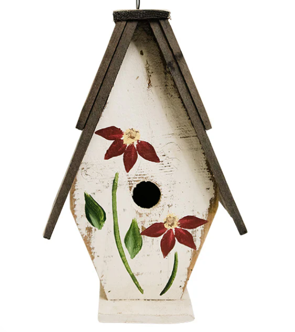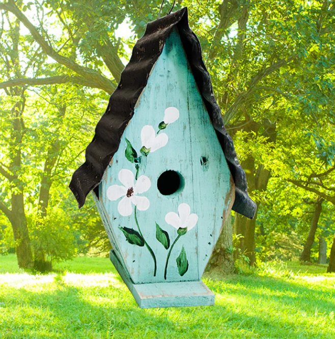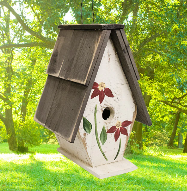 Provide delightful songbirds a colorful and reliable home with rustic appeal in your backyard bird garden with this Bird In Hand Amish Made Teal A-Frame Wren House. This striking unit’s beautiful, antique teal complexion will provide a wonderful embellishment to your garden space as you house these familiar birds in quaint style. The weathered home is decorated with natural accents as stencils of blooming white flowers and leaves adorn the front panel.