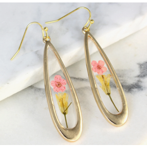 Purple Pink Dried Flower Rectangle Gold Earrings