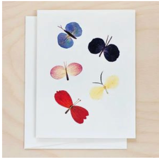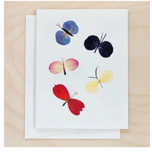 Butterflies are deep and powerful symbols. Many cultures associate the butterfly with our souls. The Christian religion sees the butterfly as a symbol of resurrection. Around the world, people view the butterfly as representing endurance, change, hope and life. This card — created from the petals of various pressed flowers — is the perfect card to send to someone facing change, especially for the gardener or lover of nature. It also makes a whimsical card for any occasion, from a birthday card to a thank you note!