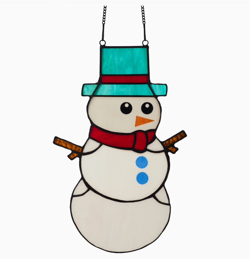 Celebrate the holiday season with this delightful stained glass window panel featuring a charming snowman design. This children's style window panel showcases a whimsical snowman, complete with an aqua top hat and a vibrant red scarf, adding a playful touch to any room. The multicolored stained glass captures light beautifully, casting a colorful glow that enhances the festive atmosphere. Designed to be hung easily with a 20 inch metal chain, this window panel is perfect for brightening up a sunny window space.