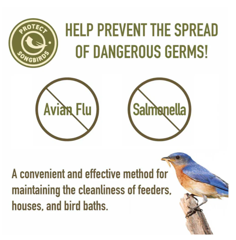 Save the birds you love with this bird feeder, bird house and bird bath cleaner. A convenient and effective method for maintaining the cleanliness of feeders, houses, and bird baths.