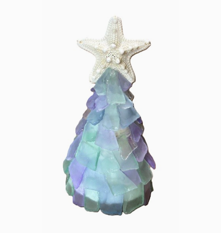 At the crown of this coastal masterpiece rests a real starfish topper—a natural and striking touch that anchors the design in authentic seaside charm. The starfish adds an organic elegance, seamlessly blending the artistry of the tree with the raw beauty of the sea. This creation exudes tranquility and coastal allure, perfect for evoking the serenity of the shore. Made in USA.