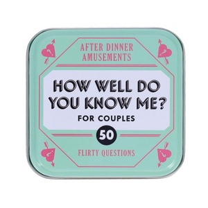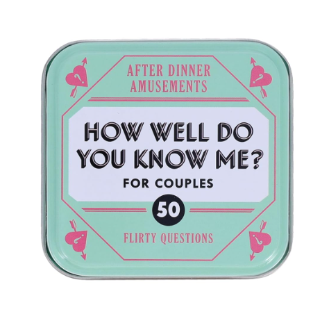 Test which partner knows the other best with this romantic addition to our After Dinner Amusements series! Pull one of these 50 flirty question cards to see if your special someone has been paying attention and relive romantic memories together.