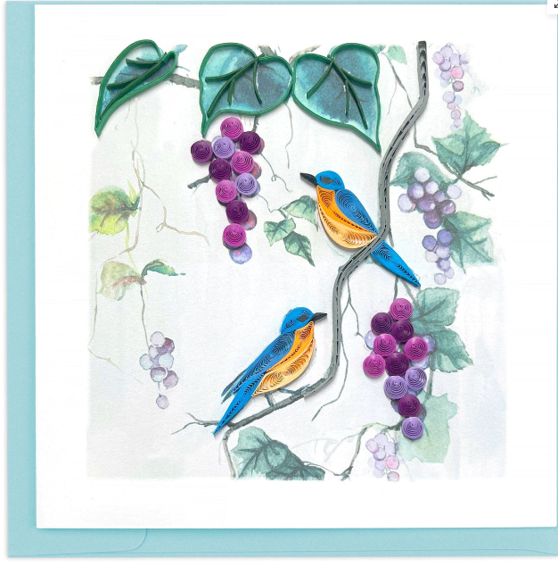 Celebrate nature’s beauty with this exquisite quilled greeting card. Featuring yellow-bellied bluebirds perched on a lush grapevine adorned with vibrant grapes, this handcrafted card is perfect for any occasion. Its intricate design and vibrant colors make it a unique and heartfelt way to send your best wishes.