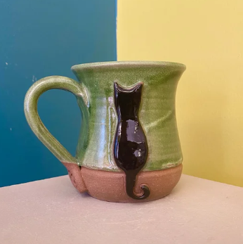 All of our mugs are hand-thrown in stoneware clay and hand-painted. This piece was hand-dipped in our lead free Wrigley's Green glaze and holds approximately 14 fluid ounces. Due to the hand-made nature of the item, please understand that no two mugs will be exactly the same. Such is the beauty of handcrafted goods!