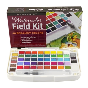 Includes 48 half-pans of transparent artist-grade watercolor paints in a versatile range of colors. Transport water in the refillable aqua brush with reservoir in its handle. The included mixing palette is divided to keep colors separate. Sturdy travel case offers additional mixing space in its lid. All-in-one Field Kit fits easily in large pockets and small bags. Perfect for plein air painting and travel. For hobbyists and professionals.
