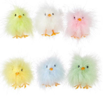 Celebrate Spring or Easter with this collection of multicolor soft and fluffy chicks! These chicks make adorable tabletop figurines and are fun additions to any Easter basket. Each chick is approximately 3" tall.