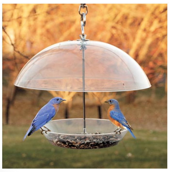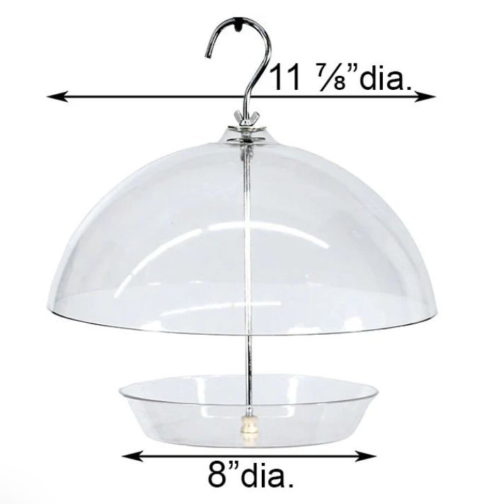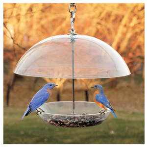 Offer bluebirds some of their favorite foods using the Audubon Domed Wild Bird Feeder. This unique station offers the versatility of a tray feeder, while remaining covered by the top dome. This 11.875" diameter, clear plastic dome may be raised and lowered along the center metal rod, limiting access to the feed by larger birds or squirrels. The 8" diameter base tray accommodates up to 1 quart of seed, mealworms, fruit, or even suet. Its clear plastic body keeps birds and feed levels visible, and small holes on the base of the tray help the seed stay dry and fresh.