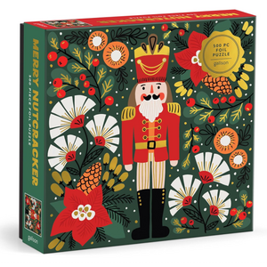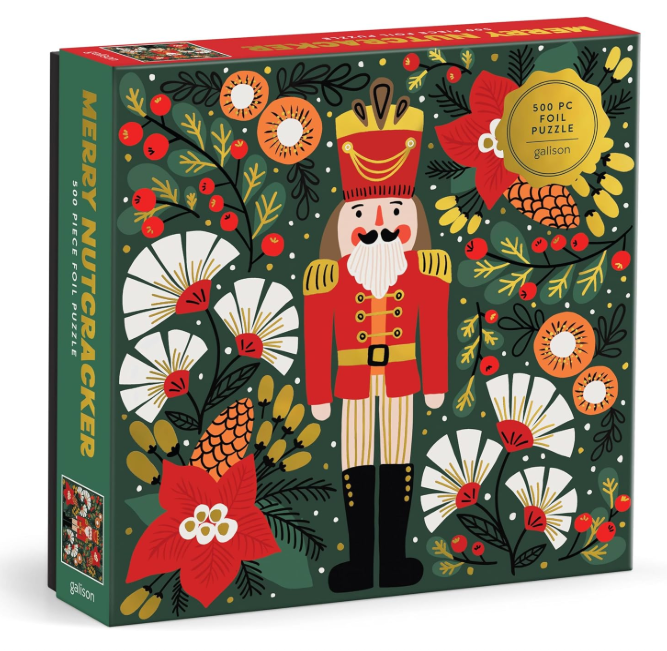 Merry Nutcracker 500 Piece Foil Puzzle by Galison features everyone's favorite toy soldier, enhanced with sparkling gold foil details. This puzzle is just the right level of challenge for the whole family to join in on for hours of puzzling fun! The box includes an insert with the full puzzle image for reference.