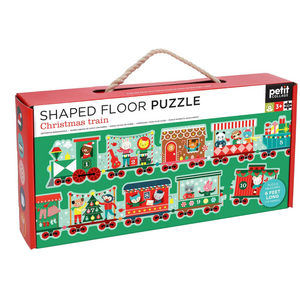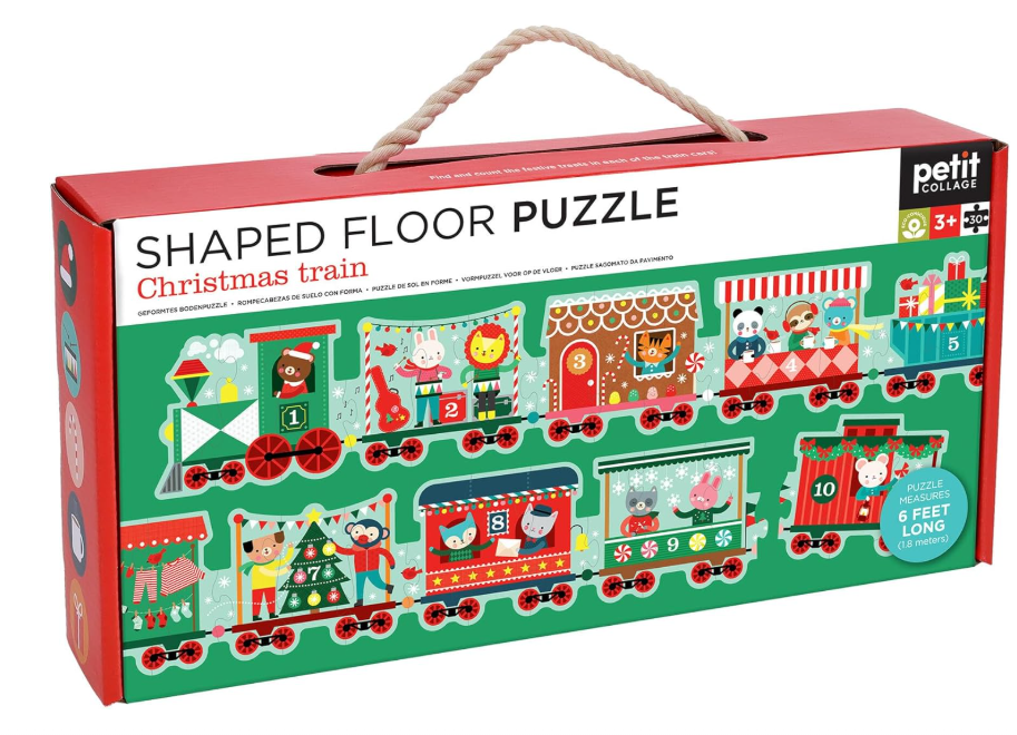 Choo-choo! All aboard the Christmas Train Shaped Floor Puzzle from Petit Collage! Made for ages 3+, connect 30 chunky pieces to complete this oversized festive floor puzzle, which measures 6 ft / 1.8 m long when finished.