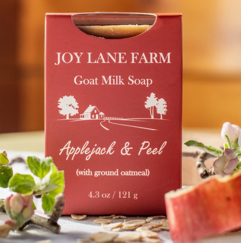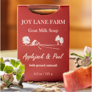 Applejack & Peel skin nourishing goat milk soap with ground oatmeal as a gentle exfoliant and a light apple scent with cinnamon, nutmeg, clove, orange, and cedarwood essential oils.