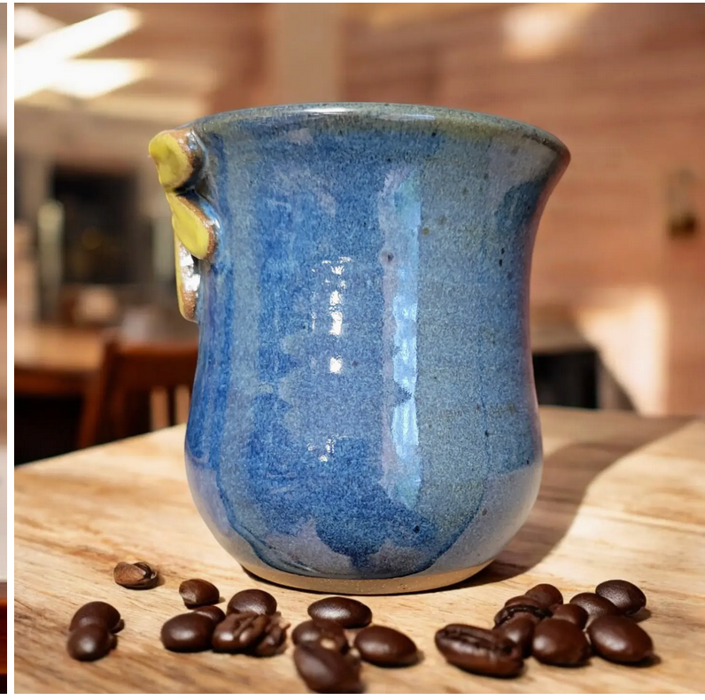 All mugs are hand-thrown in stoneware clay and hand-painted. This piece was hand-dipped in our lead free Floating Blue glaze and holds approximately 14 fluid ounces. As this item is hand-made, please understand that no two mugs are exactly the same. That unique quality is the best thing about handcrafted goods!