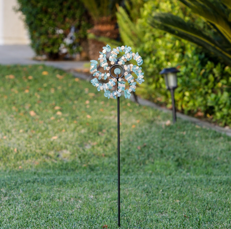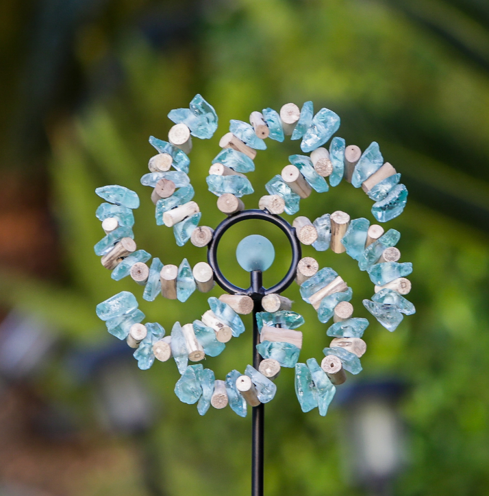 Made with genuine sea glass, each piece is uniquely shaped and weathered by the ocean, creating a soft, frosted glow that catches and reflects sunlight throughout the day. The swirl pattern adds a sense of motion and harmony, making it a captivating accent among flowers, along pathways, or in decorative planters.