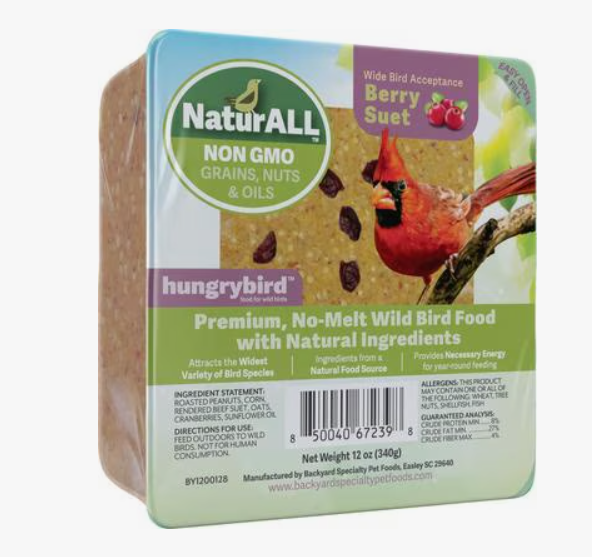 - Ingredients: Roasted Peanuts, Corn, Rendered Beef Suet, Oats, Cranberries, Sunflower Oil.