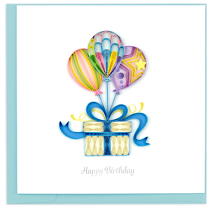Send a Quilled Birthday Card to a friend or loved one from ages 8 to 80! This paper art design is timeless and playful for any upcoming birthday celebration. The artwork features three rainbow colored balloons with intricate and unique patterns tied to the blue bow of a cream colored present.