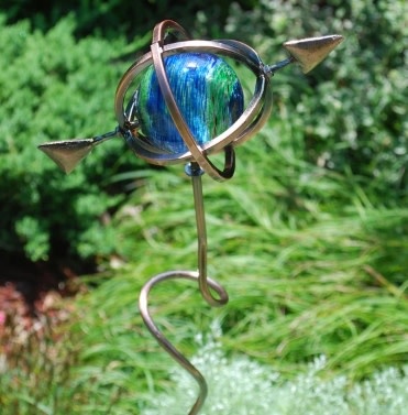 The gazing ball found on the 35" stake contains luminescent crystals that absorb the sun's light during the day and release it in the form of a soft green glow at night. The Armillary Stake is a great garden ornament that looks great in any outdoor setting. It can be used in larger container plants indoors or outdoors.