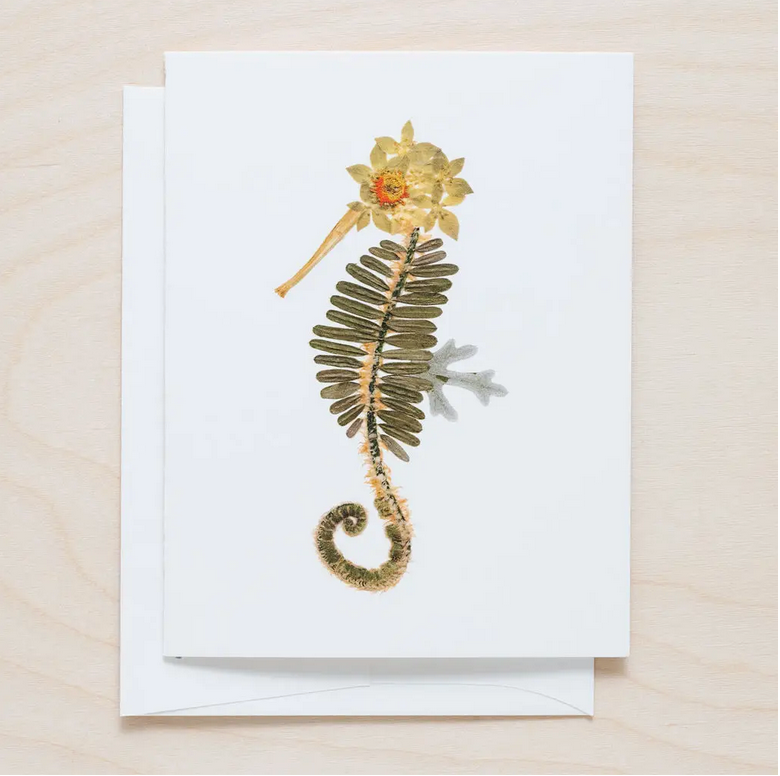 Be enchanted by the beauty of the Fiddlehead Fern that made the curled tail of this lovely seahorse. Common Vetch leaves for the body and Bupleurum blossoms for the head. A pretty all-occasion card!