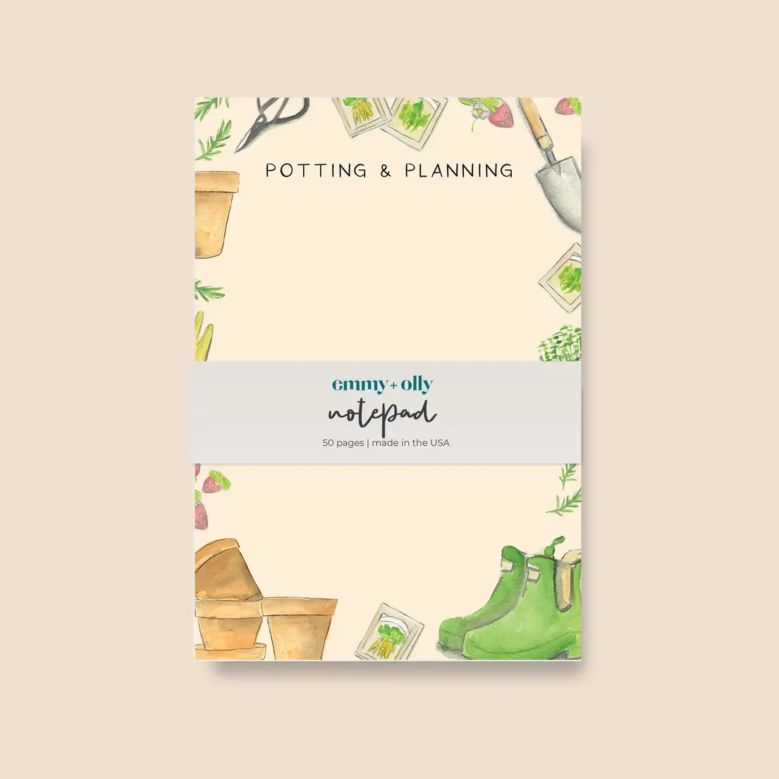 Featuring hand-painted watercolor details like pots, seed packets, gloves, and garden tools, this notepad turns even the simplest to-do list into a cozy ritual. The soft, neutral background and whimsical garden elements frame a generous writing space, perfect for jotting down planting plans, garden notes, seed starts, or everyday reminders.