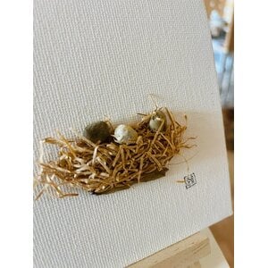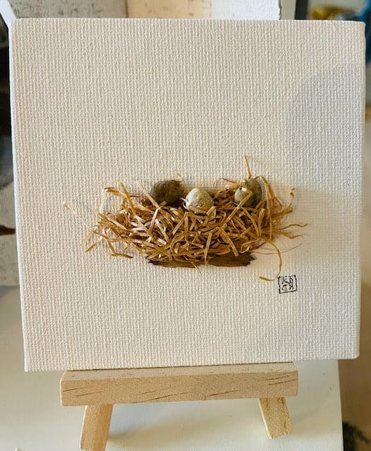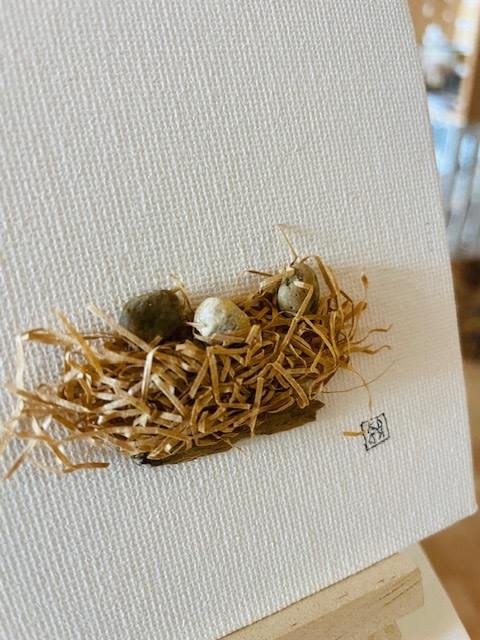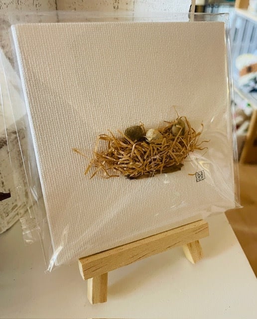 A 4" x 4" canvas board with a Bird nest and eggs, thoughtfully crafted from beach stones and grass collected along the New Hampshire coast. Includes easel and come sleeved in plastic.