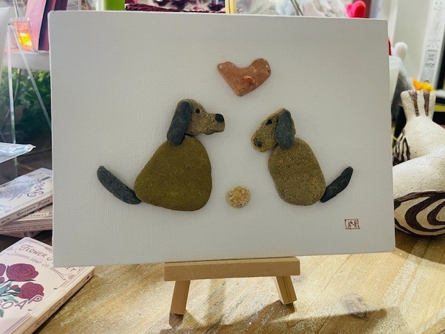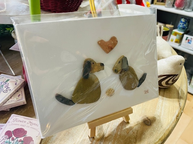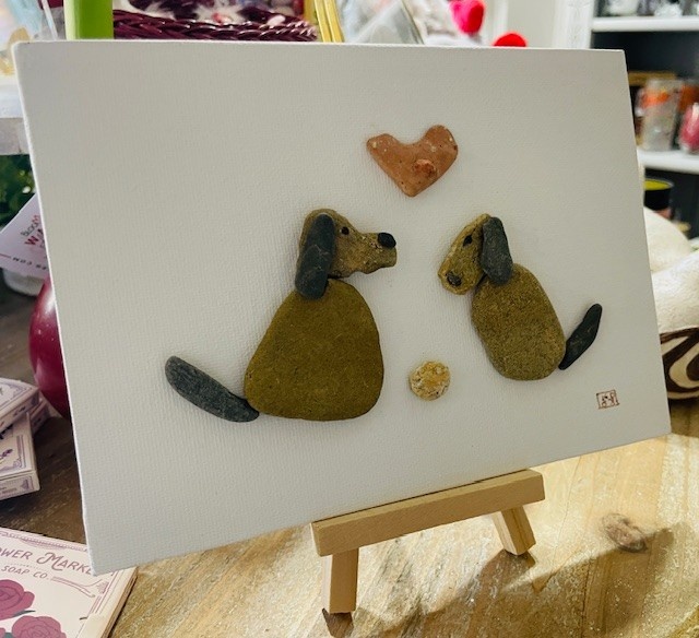 A 7" x 5" canvas board featuring two dogs in love, thoughtfully crafted from beach stones collected along the New Hampshire coast. Easel included and piece is sleeved in plastic for protection.