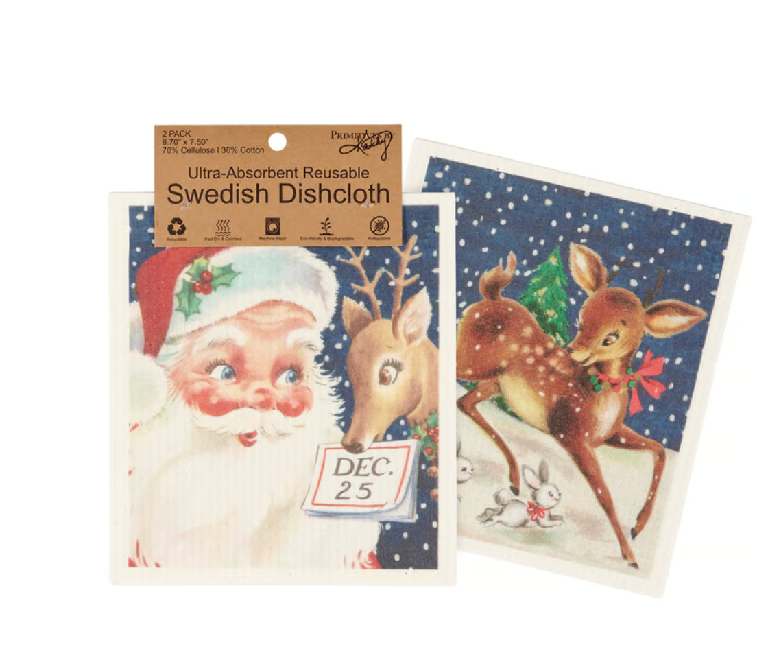 Safe to use on all types of surfaces, eco-friendly Swedish Dishcloths dry quickly and are antibacterial for more hygienic cleaning with reduced waste. This set of two Swedish Dishcloths ffeatures retro holiday designs of Santa and reindeer. Our Retro Santa Claus Swedish Dishcloth set is conveniently machine-washable for easy cleaning. Seasonal dishcloths are attached to header card with hole for easy rack display. A fun set of Christmas-themed reusable dishcloths perfect for replacing dull sponges and paper towels with long-lasting colorful designs.
