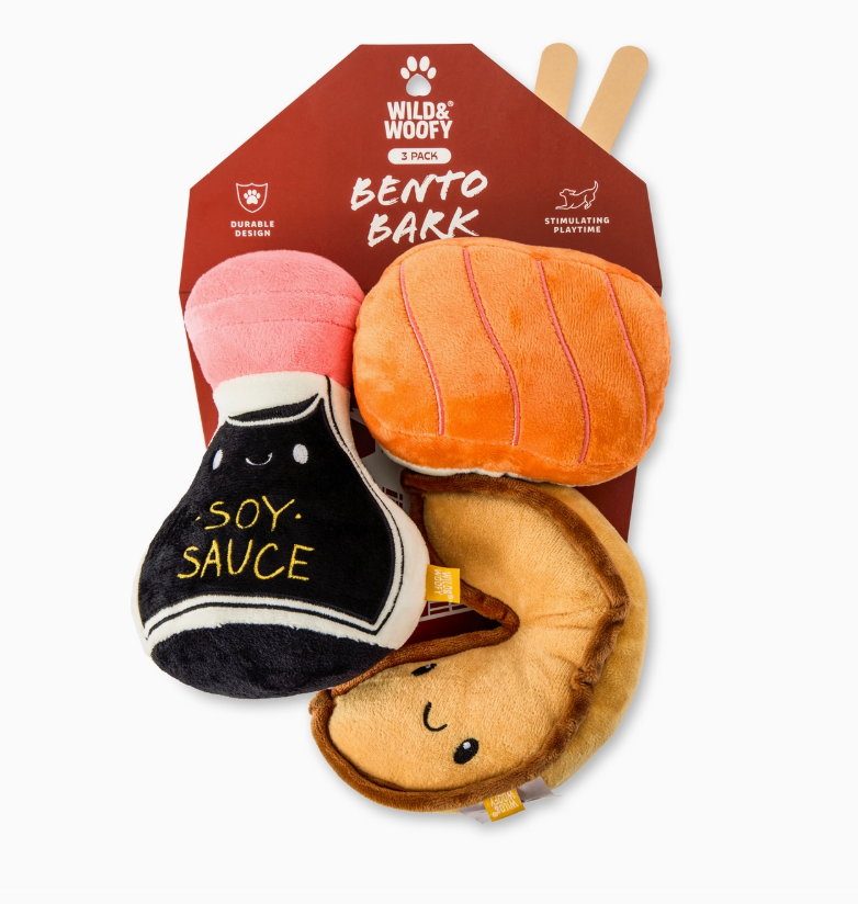 - Soy Sauce Bottle – A soft, squeaky bottle with fun embroidered details for extra charm.