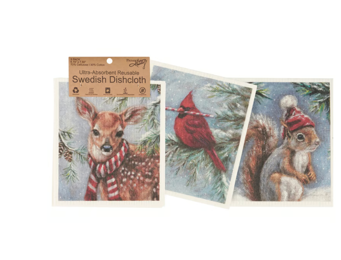 Safe to use on all types of surfaces, eco-friendly Swedish Dishcloths dry quickly and are antibacterial for more hygienic cleaning with reduced waste. This set of three Swedish Dishcloths features comforting winter scenes of woodland animals wearing winter accessories. Designs are replicated from original artwork painted onto burlap canvas, giving the art a unique depth and texture. Our Winter Animals Swedish Dishcloth set is conveniently machine-washable for easy cleaning. Seasonal dishcloths are attached to header card with hole for easy rack display. A rustic set of winter-themed reusable dishcloths perfect for replacing dull sponges and paper towels with long-lasting colorful designs.