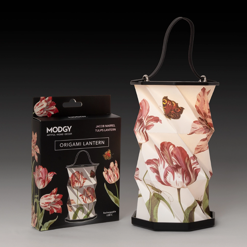 Modgy Origami Lanterns are beautiful and fun way to enhance any décor or event. Origami Lanterns are rechargeable and fold flat, then expand to three different sizes. They emit a warm, dimmable light and come with a carrying/hanging strap and a USB-C charging cord.