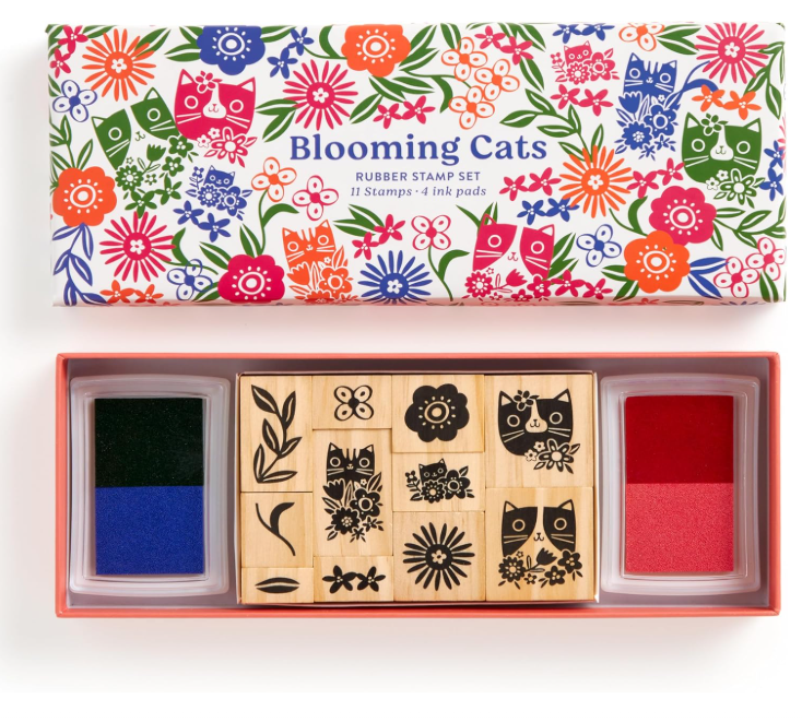 The Blooming Cats Rubber Stamp Set features 11 beechwood-handled rubber stamps and 4 ink colors packaged in a sturdy box. Create endless multi-colored floral and cat combinations, perfect for crafty gifts, custom notes, gift wrap, or decorations! Unleash your inner artist! The stamps include a variety of flowers and adorable cat faces for you to choose from.
