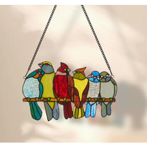 This fascinating window panel flaunts a novel depiction of birds in love, adding a charming touch to any indoor space. Crafted from multicolored glass pieces in hues of red, yellow, and blue, the design showcases a unique style. The panel lights up in the sunshine, casting a vibrant spectrum of colors throughout your room. The panel comes with a 31.75-inch metal chain for easy hanging. Clean it with a damp cloth or with lemon oil polish and dry with a clean, dry cloth to maintain its striking appearance.