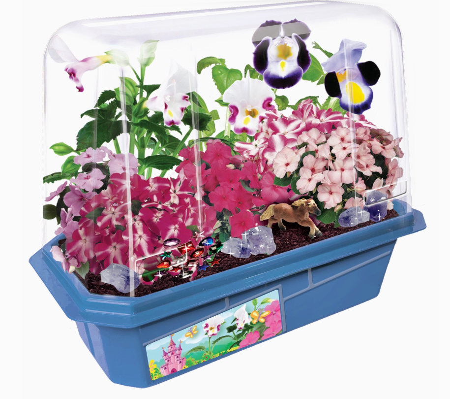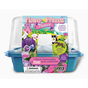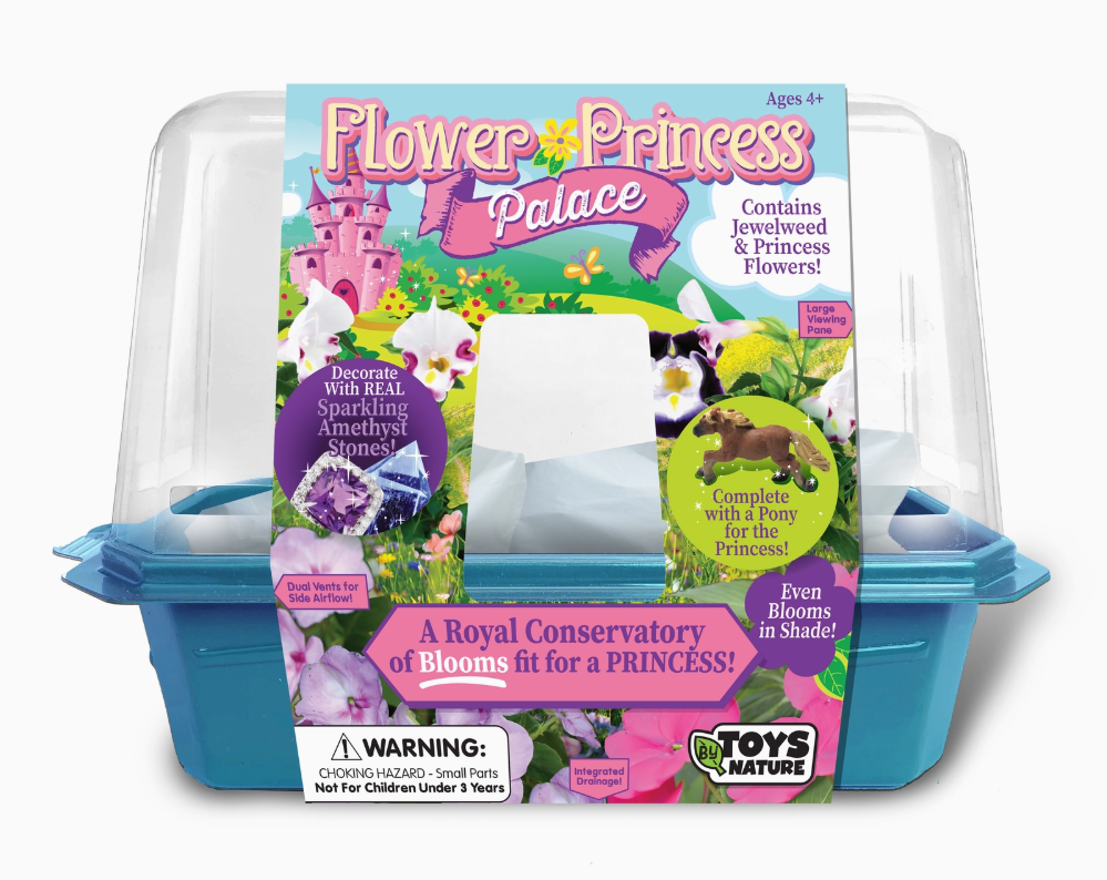 Grow beautiful, blooming plants in a setting overflowing with magical treasures. Let the little princess personalize her royal greenhouse with shimmering Royal Gemstones and play along with a Prancing Pony! The colorful pink and purple flowers of the Jewelweed pair perfectly with the exquisite blue and rose Princess Flowers. Both attract butterflies and hummingbirds and will thrive in a windowsill with bright light! Your Royal Princess Conservatory will start sprouting in a week and will bloom within two months. The complete kit comes with everything you need- just add water!