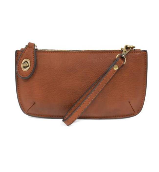 Features a removable and adjustable crossbody strap: 13″- 24” in length and a wristlet strap: 7″ long. One interior zippered pocket, six interior card slots, printed lining, and brass plated hardware.