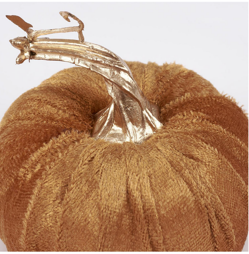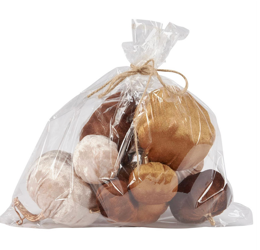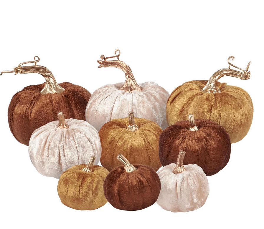 A set of decorative pumpkins featuring fall inspired brown, dark orange, and cream velvet designs with metallic gold color stems for added interest. Seasonal pumpkin set includes 9 pumpkins with a small, medium, and large size of each color velvet. Place in a display to add a stylish touch of autumn or with other decorative pumpkins as a collection. Our Fall Velvet pumpkins come packaged together in a polybag and tied with jute. A set of stylish home accents with a variety of seasonal display options.