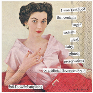 Add a splash of humor to your next happy hour with these cheeky cocktail napkins featuring a vintage-style image of a woman and the bold, relatable quote: "I won’t eat food that contains sugar, sodium, meat, dairy, gluten, preservatives or artificial flavor/color...but I’ll drink anything."