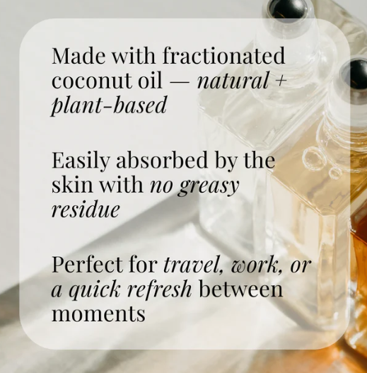 Each roll on perfume oil is made with fractionated coconut oil which is known for its moisturizing and nourishing properties. This natural, plant-based oil is easily absorbed by the skin, leaving it feeling soft and smooth without any greasy residue.