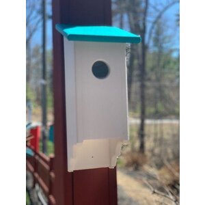 A colorful bluebird house made from recycled plastic that is made into poly material.