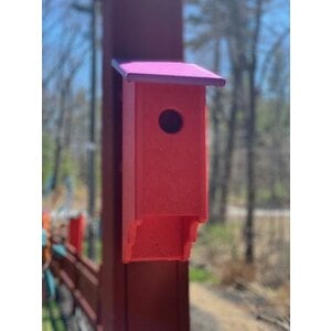 A colorful bluebird house made from recycled plastic that is made into poly material.