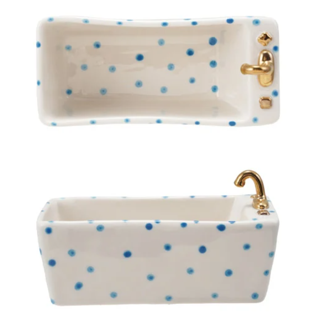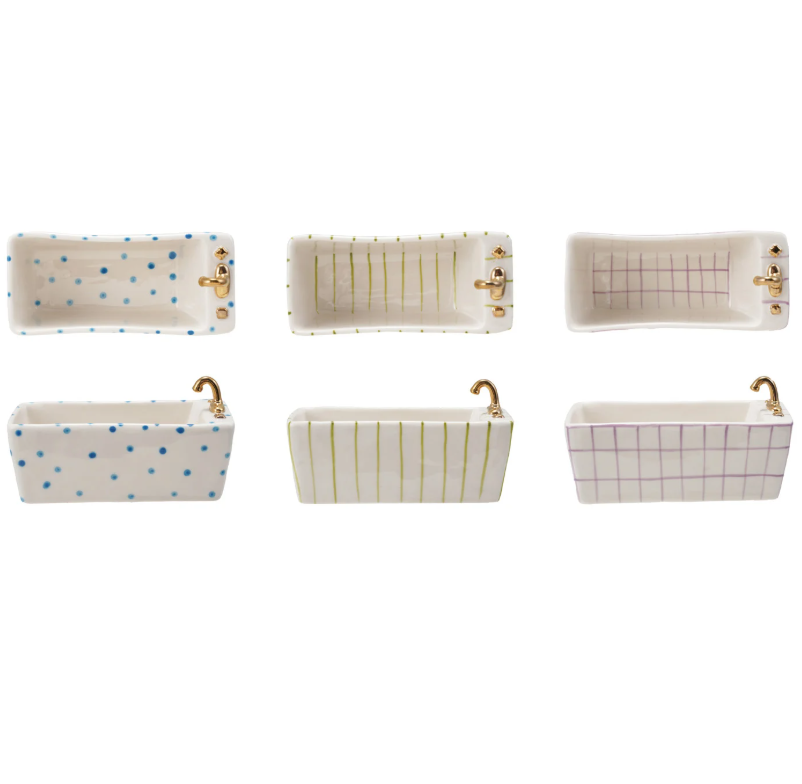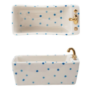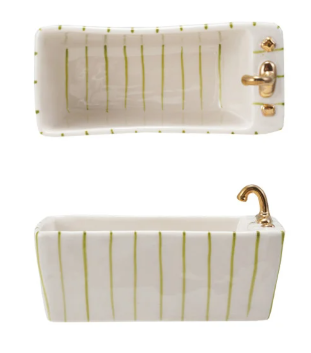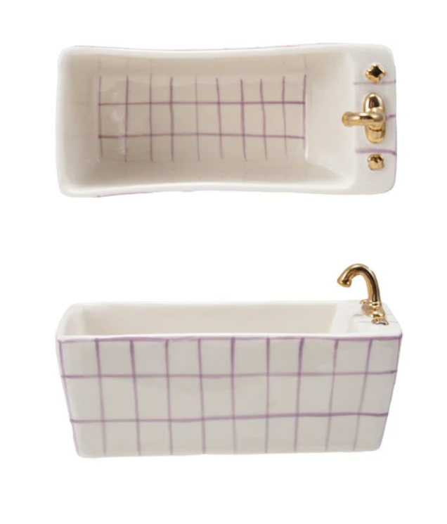 Add a whimsical, artistic touch to your home with this hand-painted Stoneware Bathtub Shaped Dish. Beautifully crafted from durable stoneware, this charming piece features a classic clawfoot bathtub silhouette, making it a unique accent for vanities, kitchens, coffee tables, or display shelves.