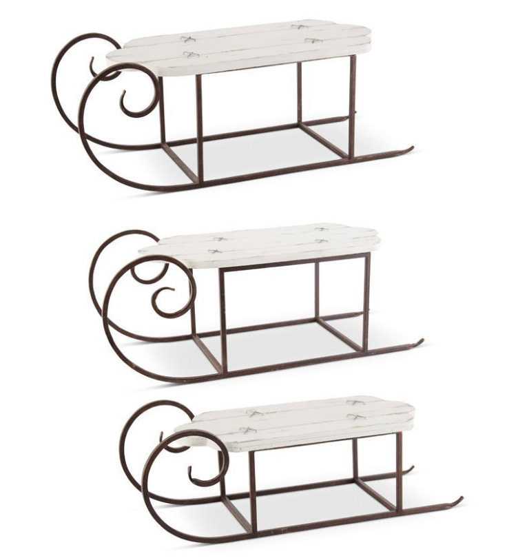 Capture the simple beauty of a snowy winter with this collection of three Whitewashed Wood Sleds with Rust Colored Runners. This charming set brings a classic, nostalgic feel to your home, evoking images of crisp winter air and old-fashioned fun.