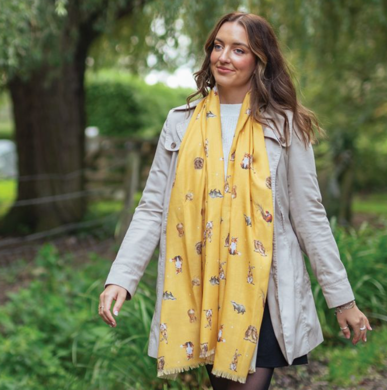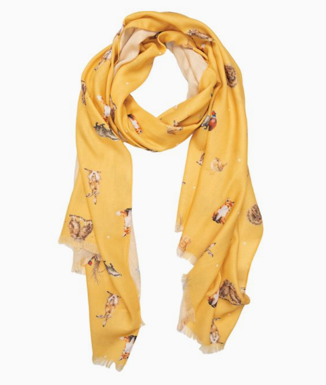 Playful yet elegant, the scarf features beautifully illustrated woodland critters, including curious foxes and adorable rabbits, nestled throughout the design. The warm mustard hue enhances the cozy, nature-inspired feel, making it an easy accent piece for both casual and dressy outfits.